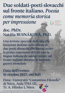 prednáša: doc. PhDr. Natália Rusnáková Špeciálna prednáška venovaná talianskym frázam v poézii dvoch slovenských básnikov, ktorí sa po prvý raz osobne stretli s taliančinou ako vojaci vyslaní na taliansky front počas 2. svetovej vojny. Podujatie v rámci 25. Týždňa talianskeho jazyka vo svete podporila Agentúra na podporu výskumu a vývoja na základe Zmluvy č. APVV-23-0586